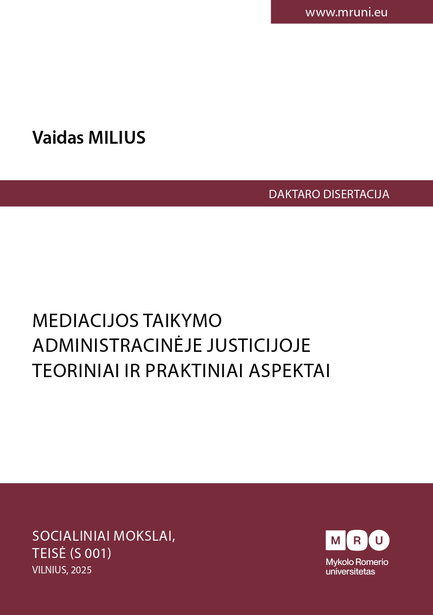 The doctoral dissertation analyses the problematic issues related to the application of mediation in administrative justice. The aim of this research is to reveal the concept of mediation in administrative justice and to identify the main problems of legal regulation of mediation in administrative disputes. The thesis is the first scientific study that comprehensively analyses the resolution of administrative disputes through mediation in administrative justice. The study aims at revealing the prerequisites of mediation as an appropriate and acceptable method of dispute resolution in administrative justice and discusses in detail the institute of a peace agreement in administrative disputes, which was one of the foundations for the application of mediation in administrative disputes. It also analyses the problematic aspects of judicial and extra-judicial mediation in administrative disputes, the implementation of such mediation, and identifies and analyses the problems that arise in this process. It focuses on identifying which administrative disputes can be the subject of mediation and whether an agreement between the State and the party subject to the administrative decision is possible for all administrative disputes. Other types of mediation in administrative disputes, which have not yet been legalized in the administrative law system at the time of the study, are analysed and presented. The dissertation presents the results of an empirical study. In the empirical study, expert interviews were conducted and the attitudes of the representatives of public administration entities towards the peaceful settlement of administrative disputes, mediation and the practical problems of the application of these two institutes as well as the possible solutions to them were determined. It can be said that a study of this scope and methodology has not been carried out so far, so its contribution to the development of legal science will be significant.