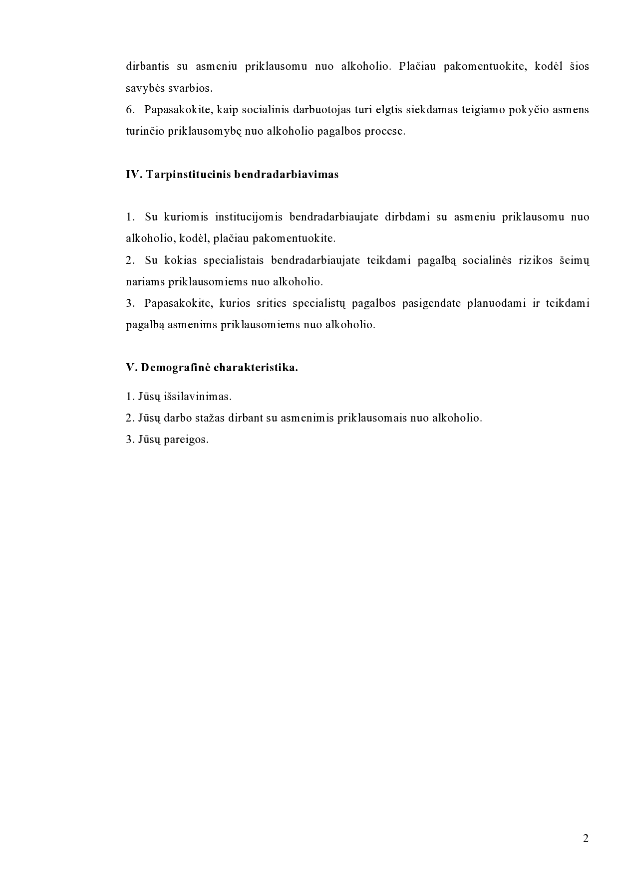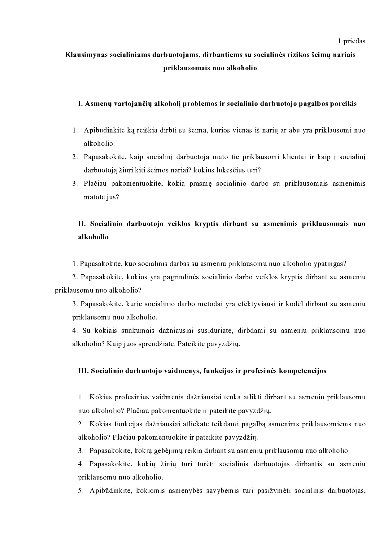 Alcohol dependence Lithuania and around the world pose a serious threat to the well-being of families and society. Family where alcohol is often fall into crisis situations infringing family balance and undermine the success of family functioning. In order to fully assist disadvantaged families are dependent on alcohol to be a social worker for help. The aim was to theoretically and empirically reveal the dependence on alcohol-related problems, the reason to promote consumption of alcohol, the consequences of family and social work dealing with the peculiarities of social risk family members dependent on alcohol. To achieve the purpose of the work was to raise the following three objectives: to define the concept of alcohol dependence theoretical aspects; discuss aspects of the social worker's help disadvantaged families persons addicted to alcohol; reveal the role of a social worker with families at social risk individuals with alcohol dependence characteristics.