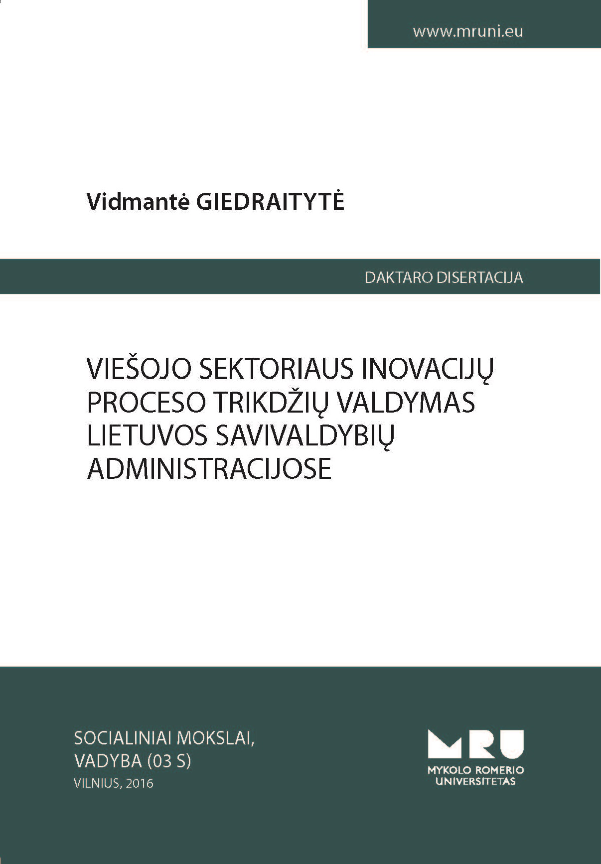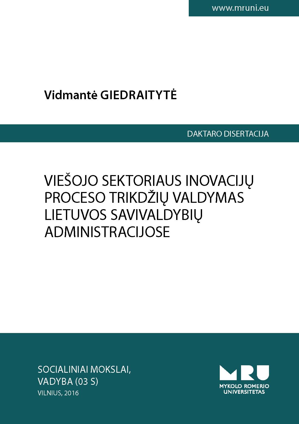 Dissertation analyzes public sector innovation process barriers’ management in Lithuanian municipal administrations. Global processes of the twenty-first century determining social, economic and political changes, require innovative solutions and successful implementation of public sector innovation processes. Public sectors innovation process implementation is often distorted or stopped by barriers resulting from institution’s internal, political, legal or external collaboration related environment. Institution’s ability to identify innovation process barriers and develop as well as apply proper tools of their management, determines innovation process quality and efficiency, thus, barriers management is identified as one of the fundamental conditions for successful innovation process. The problem of innovation process barriers management requires special and complex research, thus this PhD Dissertation is dedicated for this problem solving. Dissertation consists of theoretical reasoning and empirical research, on the basis of which, the concept of public sector innovation process management in Lithuanian municipal administrations is developed. The concept can help to identify innovation process barriers, to evaluate innovation processes favourable environment and to select the most suitable barriers management tools and actions.