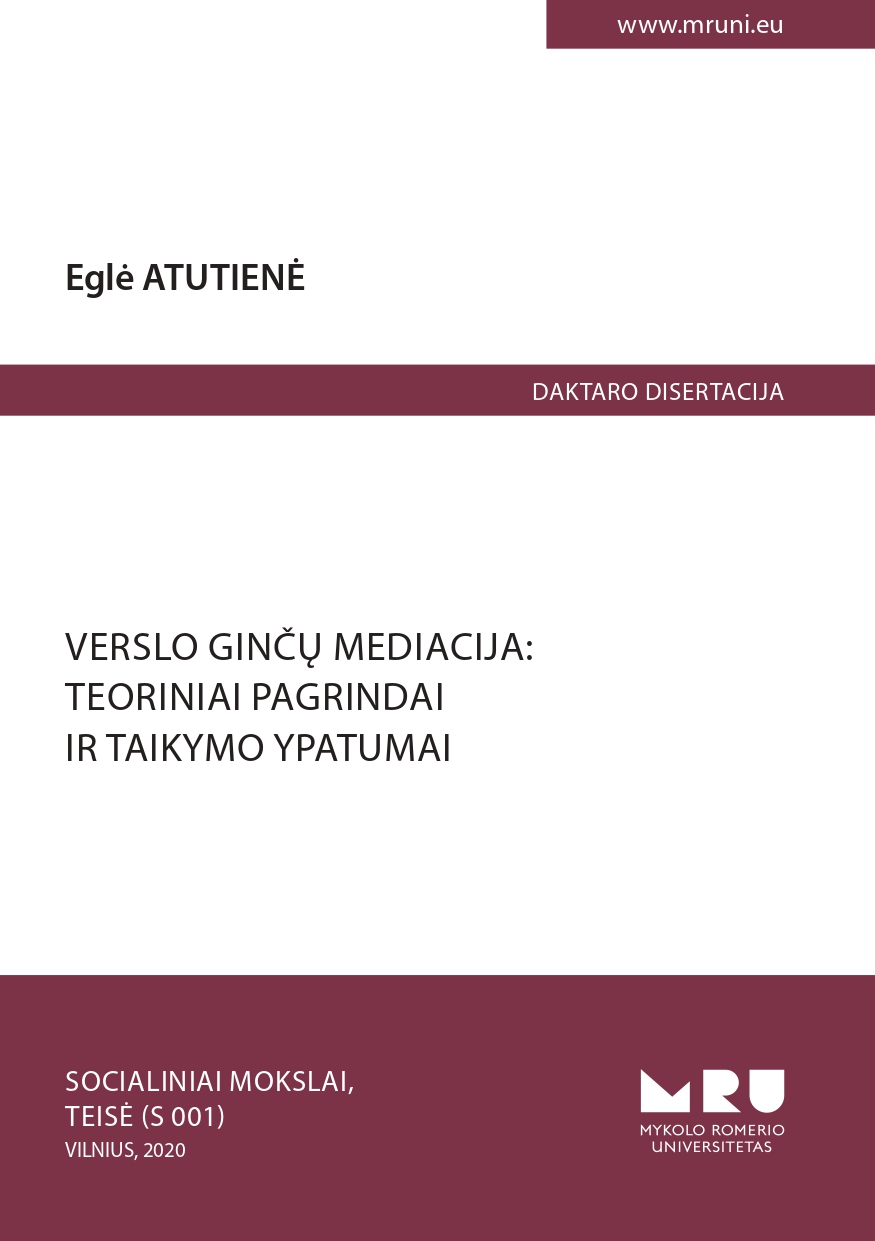 The purpose of the research - to reveal the theoretical basics of mediation - as a way of solving business disputes - and peculiarities of its application. In order to fully disclose the chosen research subject, it was decided to analyze the fundamental features of business dispute mediation and the concept of business disputes. The author of the dissertation seeks to answer the question of why the Lithuanian legal system should make some room for a business dispute mediation? The dissertation deals with the investigation of the peculiarities of mediation in when a different category dispute is being resolved, mediation in the resolution of international commercial disputes and business mediation characteristics in other countries. The conceptions of the mediation agreement as a contractual basis of business dispute mediation as well as the agreement over the heart of the dispute are discussed. The dissertation presents the results of quantitative research on the peculiarities of mediation its application in business carried out by the author. Finally, the development concept of business dispute mediation in the Republic of Lithuania, proposed by the author of the dissertation, is presented.