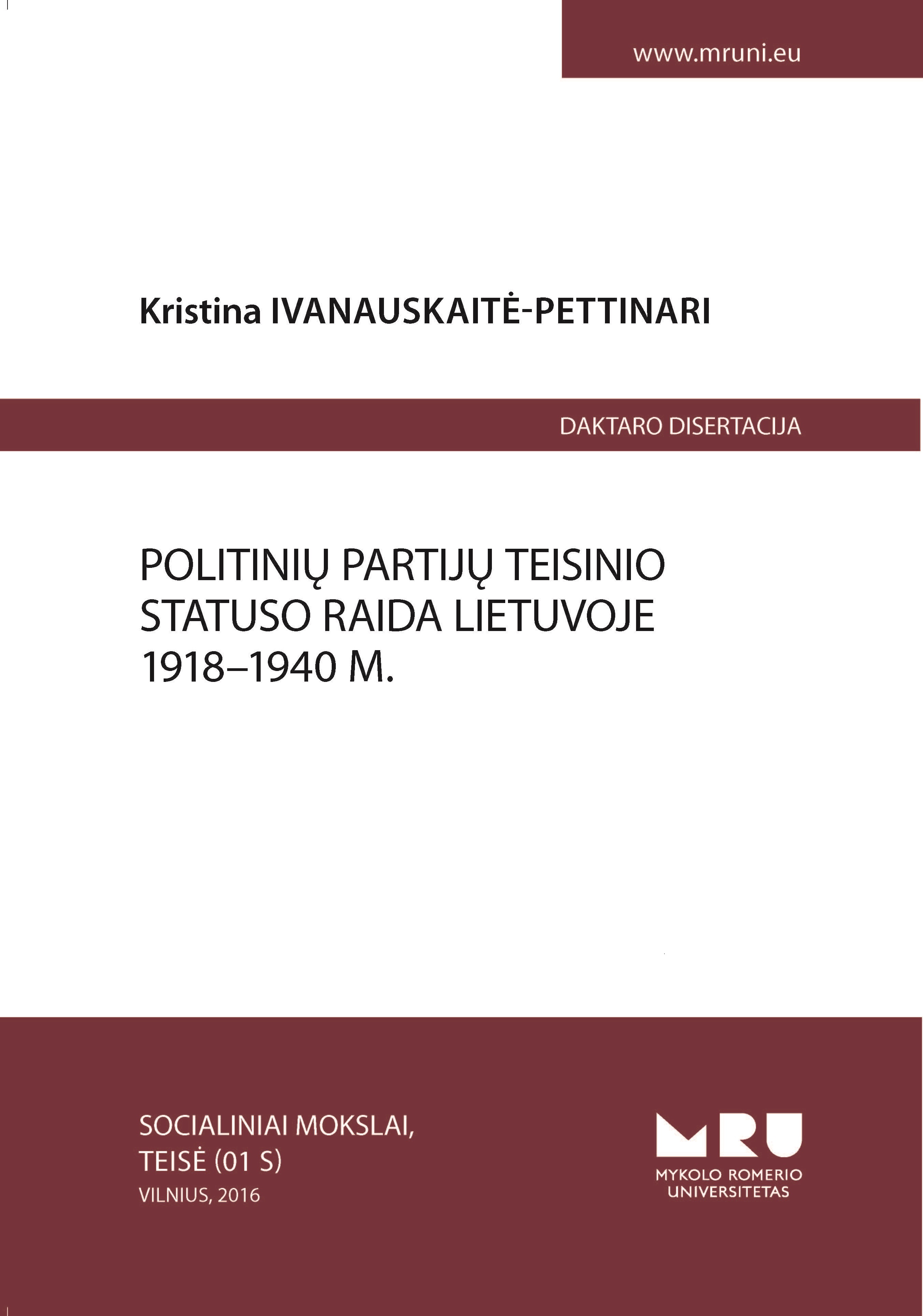 A modern democratic State cannot imagine itself without parties, with which the idea of representation and its practice in society are deeply connected. The legal regulation of parties and the knowledge of its evolution are problems constantly relevant not only because the democracy itself requires a specific legal status of parties, but also because it defines its characteristics. In this thesis, the parties are analysed in the terms of the history of law, in order to reveal their legal status in the context of the development of Lithuania in the “1918–1940” period, as well as to discuss – from the “pre-history” of parties to Lithuanian independence in 1918 – the differences between Lithuanian political movements and political parties and the reasons for which parties were losing public confidence, the democracy which they were establishing has started to lose popularity inside Lithuanian society and the coup of 1926 has significantly limited the activity of parties and their pluralism, so that the structure of the regime of the State has turned into authoritarianism. In 1940 the regime of occupation of Soviet Union has forbidden all parties except the communist one, in a way that not only has interrupted the development of the democratic regulation of the activity of parties, but also has altered their authentic nature. The historical analysis of political life of Lithuania in 1918–1940 take to the conclusion according to which, even if at the birth of democratic state parties began to raise as interest groups above the public, they – and the representative democracy based on them – have been subjected to crisis of confidence, which, in that time in Lithuania, has ended with the Coup d’Etat of 1926.