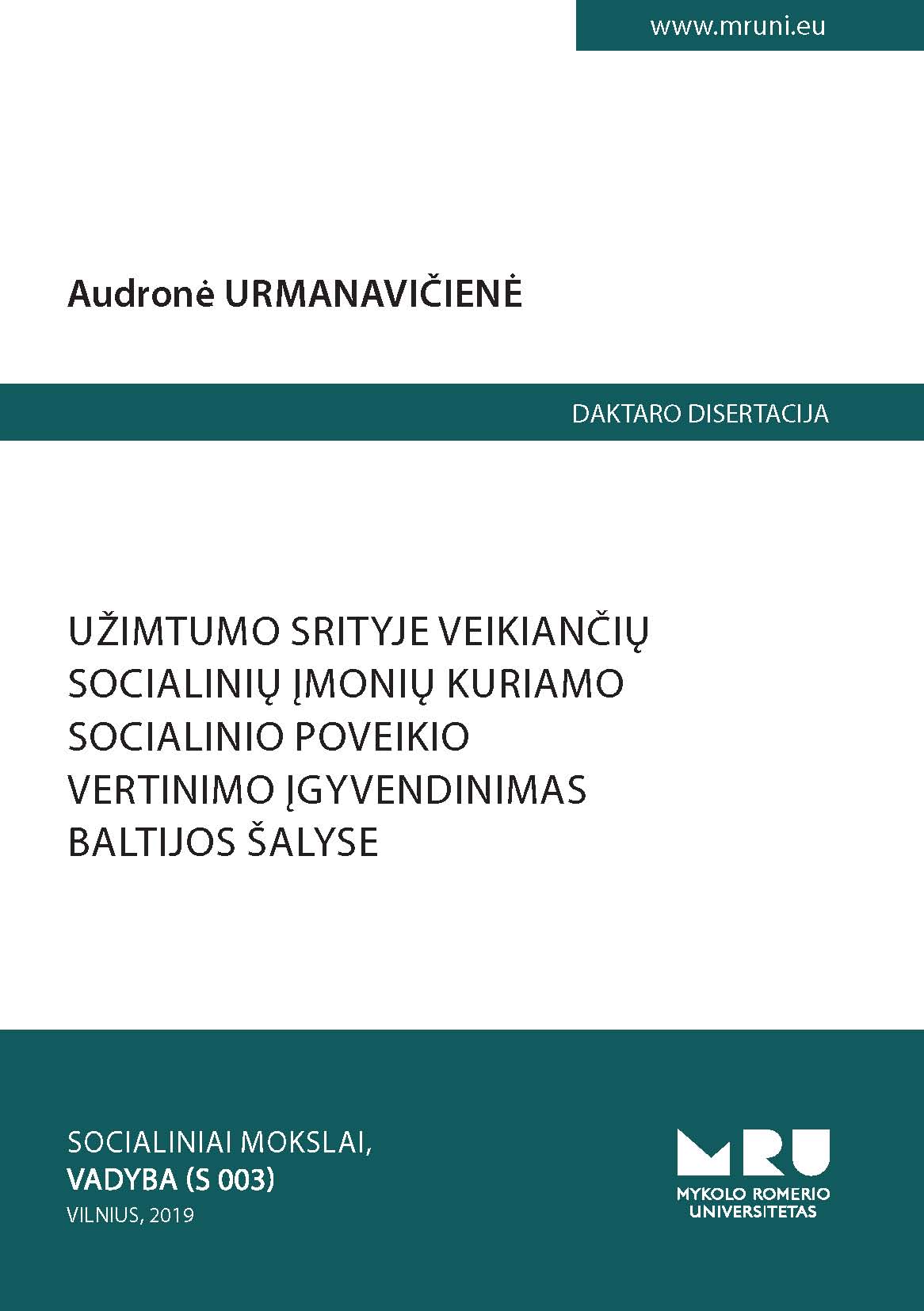The dissertation analyzes the implementation of social impact assessment of work integration social enterprises in the Baltic States.The importance of implementing social impact assessments for social enterprises is increasingly emphasized in the scientific literature and EU guidance acts. However, the implementation of social impact assessment is hampered by barriers and limitations within the organization’s internal and external environment. Besides, for work integration social enterprise, the implementation of the social mission requires additional resources and time. Social impact assessment practices in organizations are not widespread. In order to achieve sustainable development of the social enterprise sector, successful integration of disadvantaged people, and efficient use of funds, it is essential to identify how to implement a systematic, regular assessment of the social impact of work integration social enterprises, with existing obstacles and limitations in the internal and external environment of organizations. The problem of implementing social impact assessment requires a holistic approach, taking into account the internal and external environment of the organization. The dissertation analyzes theoretical aspects of social impact assessment implementation and research on social impact assessment implementation in the Baltic States. Based on theoretical and empirical research, the concept of implementation of social impact assessment by work integration social enterprise provides a better understanding of the environmental conditions of implementation of the Baltic States assessment process, preconditions for overcoming obstacles and limitations, actions and measures required for implementation of systematic, regular social impact assessment of social enterprises.