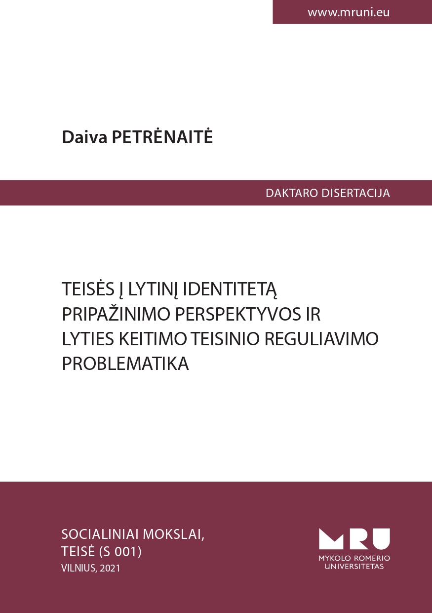 The doctoral thesis raises the following issues: ‘What is gender identity and whether the recognition of gender identity is significant for the society and the law?’ ‘To what extent does it affect solution of issues related to exercise of rights by a person who has undergone gender reassignment?’ ‘Why transsexuality as part of gender identity is recognised in medical science as a gender identity disorder?’ ‘Does it not violate the dignity of transgender persons if they are regarded as people with a mental disorder?’ The present thesis defines the concept of gender identity, discloses the content of the right to change gender, analyses theoretical and practical issues of new gender identity recognition and issues pertaining to the regulatory framework of the rights of transgender persons. The purpose of the study was to prove that gender identity is part of human dignity and private life. The analysis of case law demonstrated that the lack of the regulatory framework that would enable exercising of the right to gender identity by transgender persons in Lithuania allows making an assumption of inconsistent case law being developed in Lithuania, while change of gender in personal legal documents shall be related not only to physical intervention into a human body, but also to the psychological self-identification with the opposite gender.