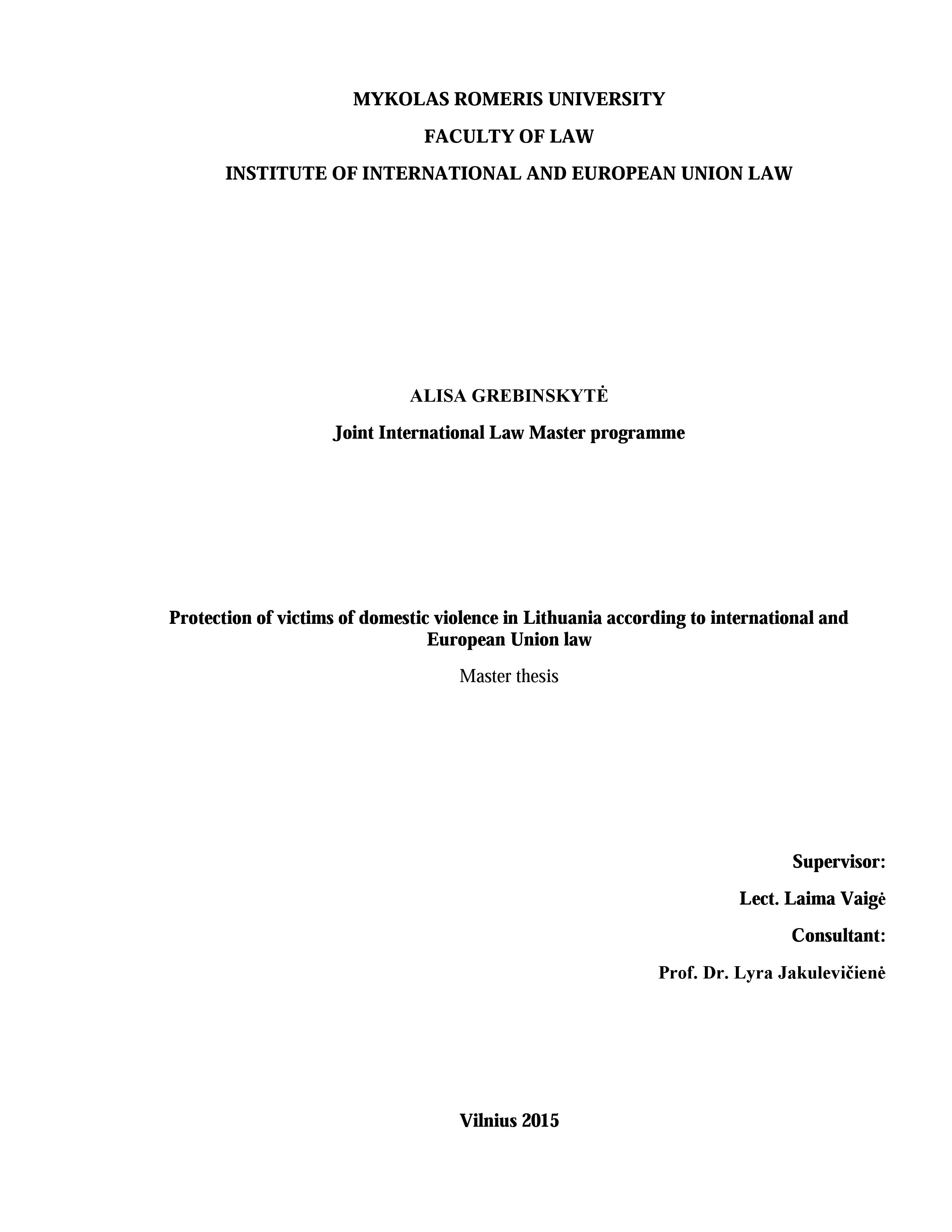 Domestic violence for a long time was a hidden crime, which was a concern of two people. Few decades ago this serious problem became an important matter in the international community. Various international and European documents such as CEDAW, ECRH, Istanbul Convention have condemned domestic violence and recognized it as the public matter, which has to be solved with the interjection of the State. It was agreed internationally that State has a positive obligation to protect victims of domestic violence and punish those, who initiate it. However, Lithuania, as a party or signatory to those treaties, does not act due to international obligations: the domestic violence still is on a high prevalence level.
