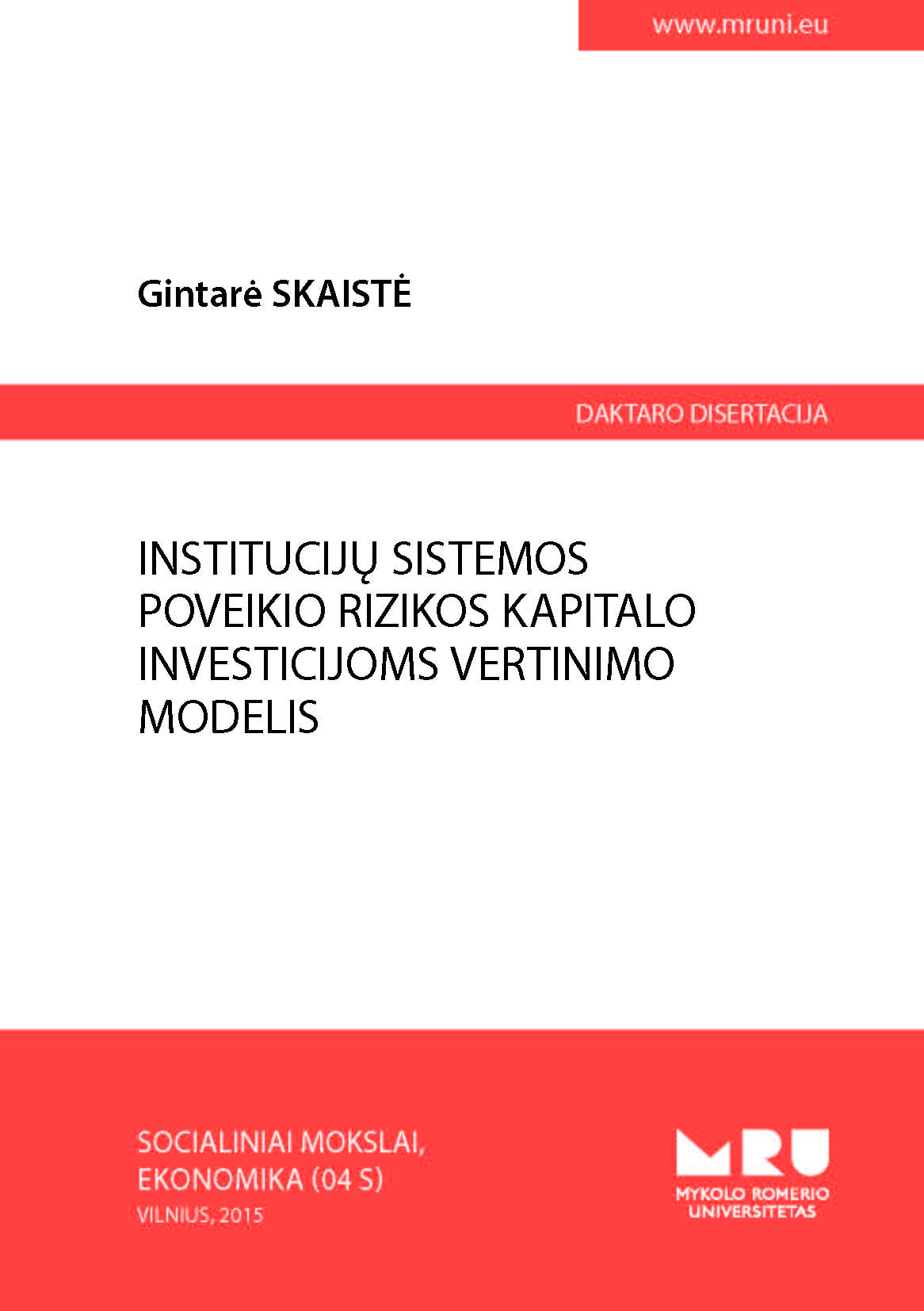 Daktaro disertacijoje sprendžiama mokslinė problema, kokia institucijų sistema daro poveikį rizikos kapitalo investicijoms ir kaip ji veikia rizikos kapitalo investicijas. Darbe teoriškai pagrįsta, kad institucijų išsivystymo lygis sąlygoja rizikos kapitalo investicijas. Tyrime remiamasi visuminiu požiūriu, kad visos rizikos kapitalo investicijas sąlygojančios institucijos egzistuoja sistemoje ir veikia vienos kitas, pasiekdamos tam tikrą nuoseklumą susietumo ir integracijos prasme. Disertacijoje sukurtas ir praktiškai pritaikytas institucijų sistemos poveikio rizikos kapitalo investicijoms vertinimo modelis, kuriame apibrėžta rizikos kapitalo investicijas sąlygojančių institucijų sistema, susidedanti iš skirtingų institucinių lygmenų: socialinio įsitvirtinimo, institucinės aplinkos, valdymo ir išteklių paskirstymo. Kiekviename iš šių lygmenų veikia skirtingos institucijos. Pagrįsta, kad aukštesniuose instituciniuose lygmenyse veikiančios institucijos sąlygoja rizikos kapitalo investicijas ir žemesniuose instituciniuose lygmenyse veikiančias institucijas. Empirinio tyrimo metu įvertintas ir palygintas institucijų sistemos poveikis rizikos kapitalo investicijoms skirtingo institucinio išsivystymo lygio ES šalių grupėse. Disertacijoje sukurta institucijų sistemos kokybę vertinančių rodiklių ir jų poveikio rizikos kapitalo investicijoms vertinimo metodika, kuri įgalina tirti rizikos kapitalo investicijas sąlygojančių institucijų sistemos kokybę.